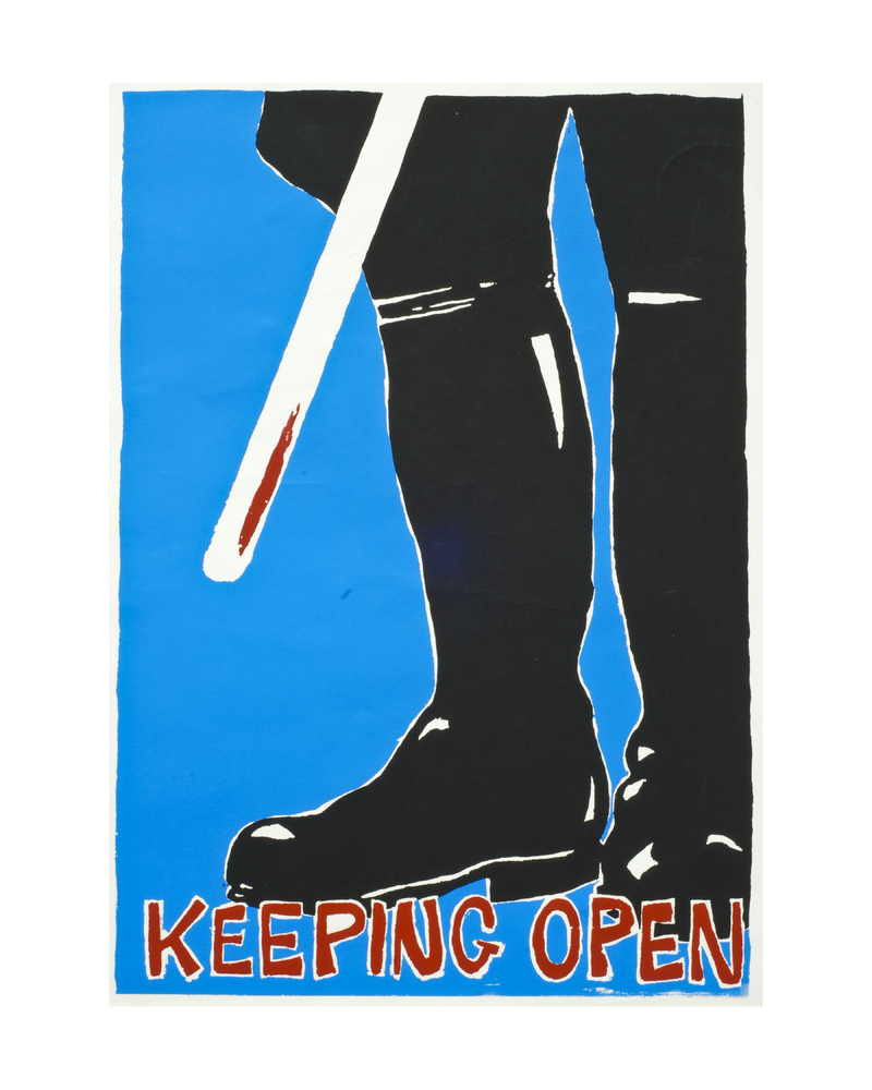 Red, white, and blue image of a police officer holding a baton with the words “KEEPING OPEN” printed below.